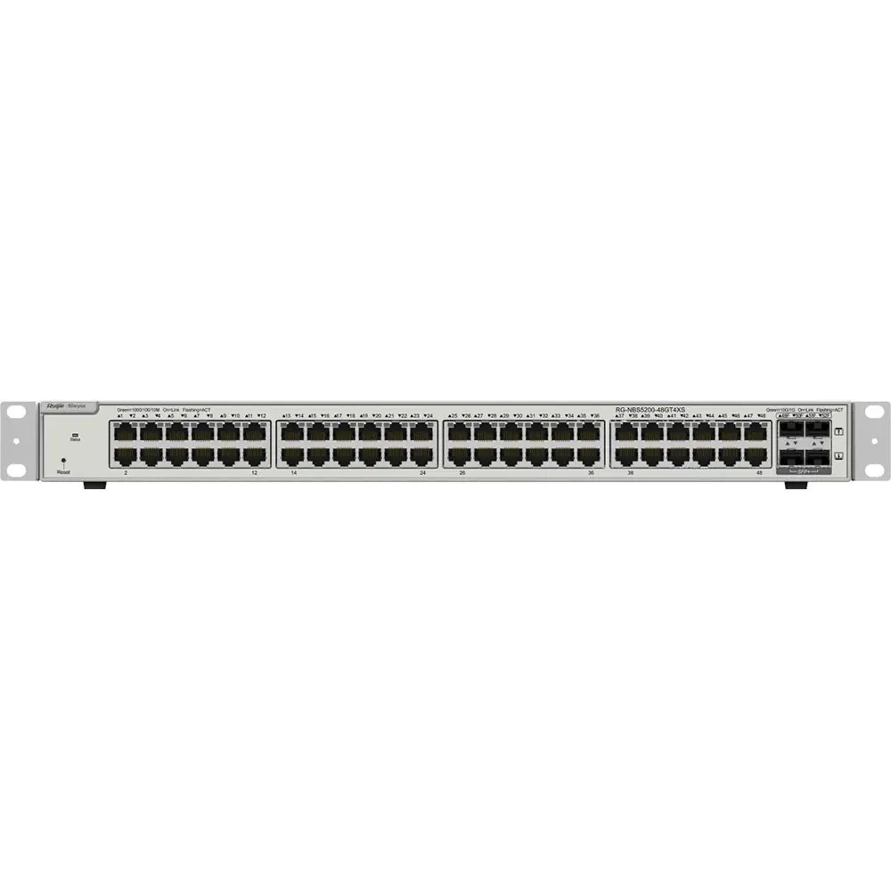 The RG-NBS5200-48GT4XS is a high-performance networking switch designed for secure, enterprise-class network environments. It combines Layer 3 static routing and multiple security policy capabilities with Ruijie Cloud lifetime management, making it a fit for networking and security deployments that require centralized cloud management and the option for professional on-site installation and ongoing support.